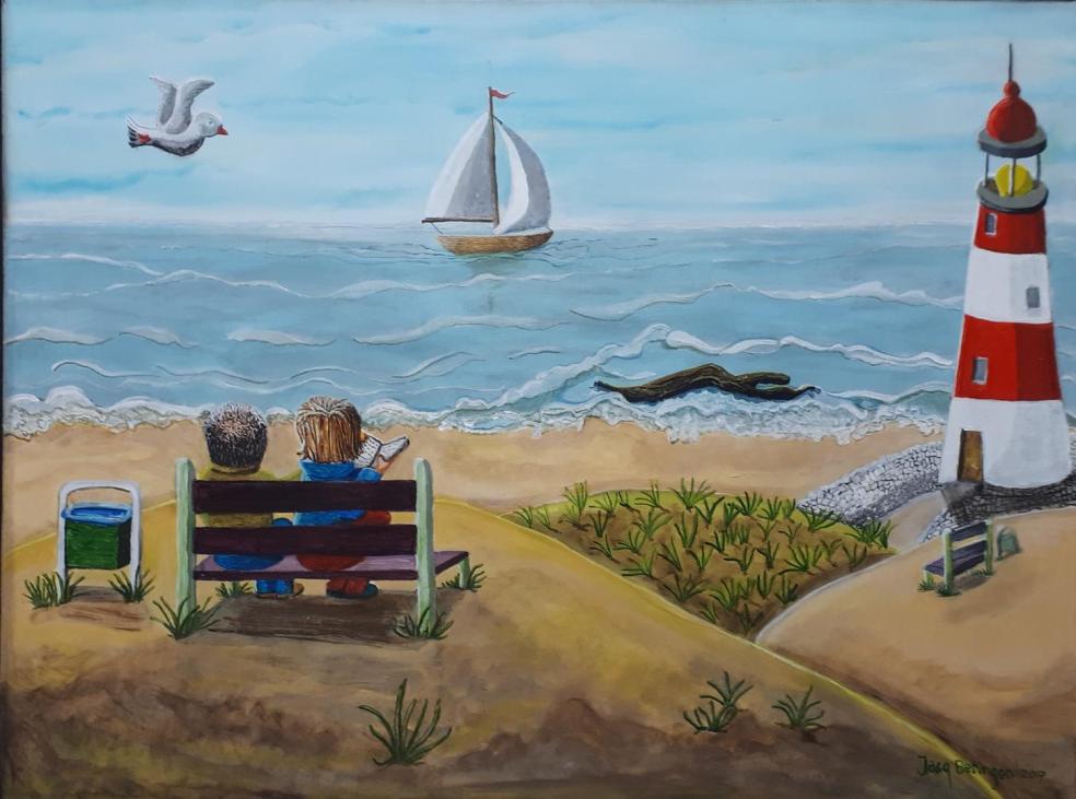 Jacqueline Wammes presenteert een twintigtal van haar schilderijen met motieven van de zee, de natuur tot aan duiven en konijntjes toe. Kortom, een grote variatie in onderwerpen, altijd even vrolijk en kleurrijk. Zij heeft jaren gelden een psychose gehad waardoor zij het schilderen en tekenen weer van begin af aan moest ontdekken. Door te oefenen in zweet en tranen, te oefenen en nog eens oefenen is zij weer op een redelijk niveau gekomen. Eerlijkheidshalve nog geen Rembrand. Maar vrolijkheid en spontaniteit spatten van haar doeken. Natuurlijk zullen haar schilderijen in de toekomst alleen maar beter en perfecter worden. ‘Ik werk daar bijna elke dag met passie en vreugde hard aan’, aldus Jacqueline.