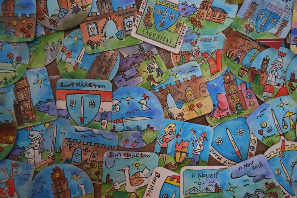 Rob maakt ook groter werk. Op houtschijven van eiken en beuken, leuk voor in de tuin. Of aquarellen van 50x70cm. Maar ook een zogenoemde “bar-mail”, een Rob op een bierviltje.